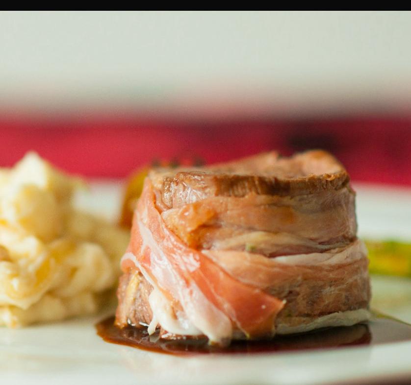 Filete de res envuelto en jamón serrano, para potenciar jugosidad y sabor.