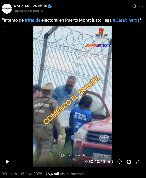 Durante la jornada electoral, comenzó a circular un registro donde se observa a una persona portando una urna junto a un automóvil, acompañado del mensaje: “Intento de fraude electoral en Puerto Montt”.