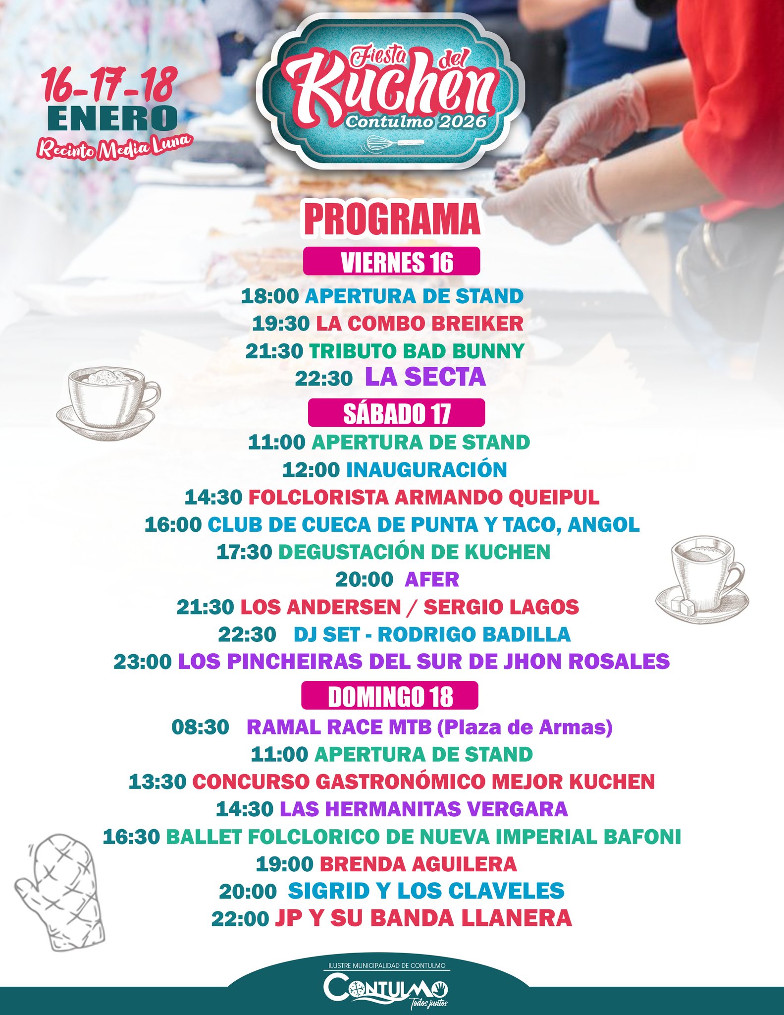 Los días 16, 17 y 18 de enero, la comuna de Contulmo te invita a ser parte de una de sus celebraciones costumbristas más tradicionales: la Fiesta del Kuchen, un evento que reúne sabores, identidad y cultura en pleno verano.